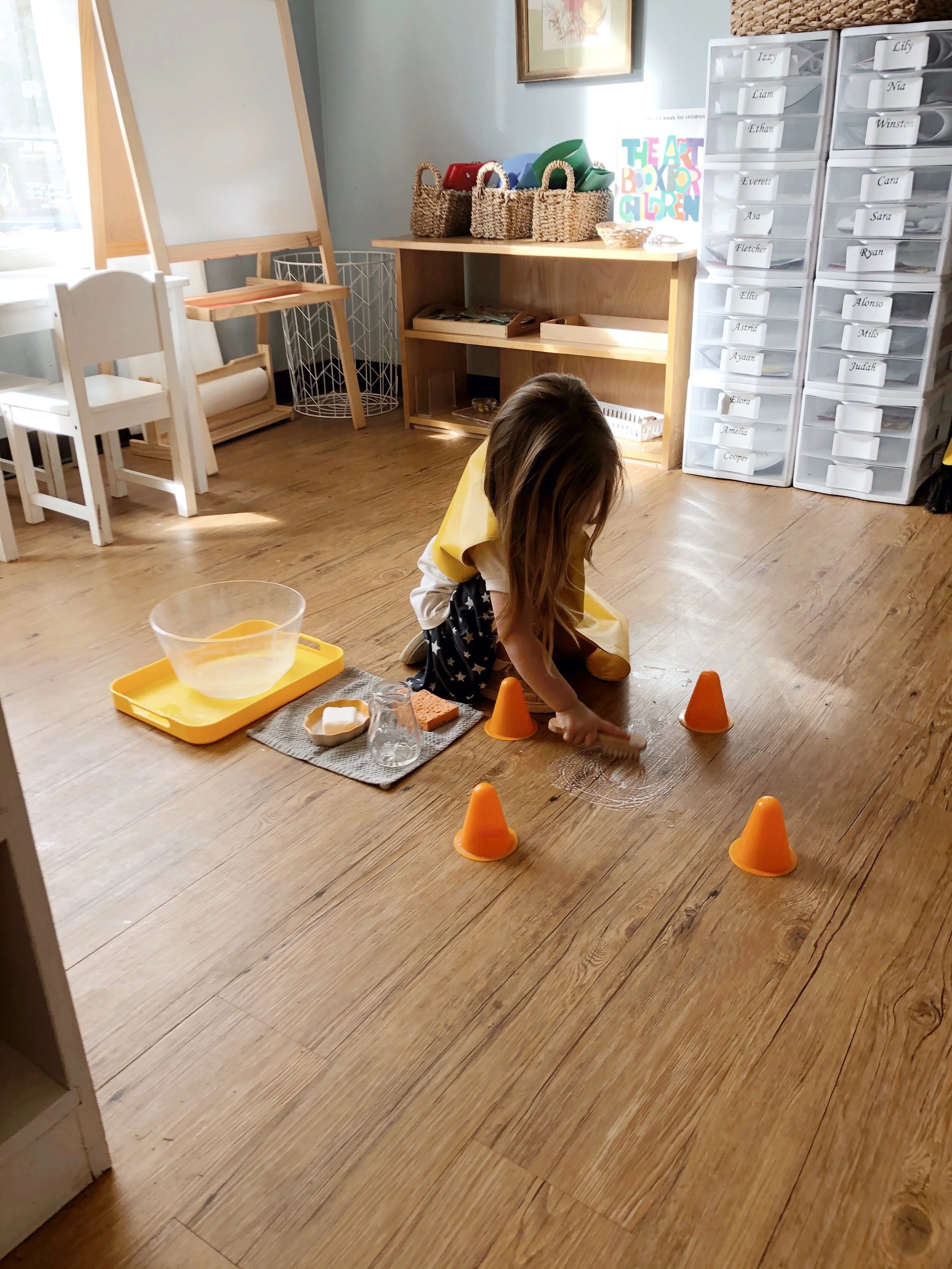 With real objects. The Montessori environments offers children the opportunity to work with real objects. Did you know that research confirms that children have a preference for real objects over their pretend counterparts? (Taggart, Fukunda & Lillard, 2018). In a Montessori classroom, children have the opportunity to prepare real food, clean with real supplies, and learn with tangible materials. These objects are made with real materials, like glass and fabric. This approach differs from items traditionally offered to children that are made indestructible with plastic.